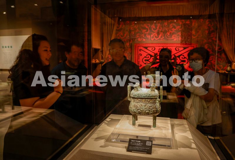 图片说明:2024年5月16日,在山东省滕州市博物馆,游客在观赏国家一级文物“滕侯”青铜鼎。