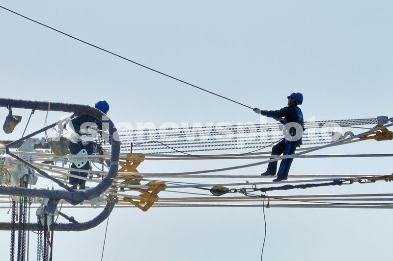 2024年5月16日,电力工人正在位于宁夏固原市隆德县境内的“宁电入湘”工程宁2标段进行导线展放作业。当日,随着电力工人将最后一根导线展放完成,标志着“宁电入湘”工程宁夏段#613-#619架线段最大难度线路跨越完成贯通。这也是近年来宁夏电网首次实施“4条交流线路+1条高速公路”同跨施工作业。