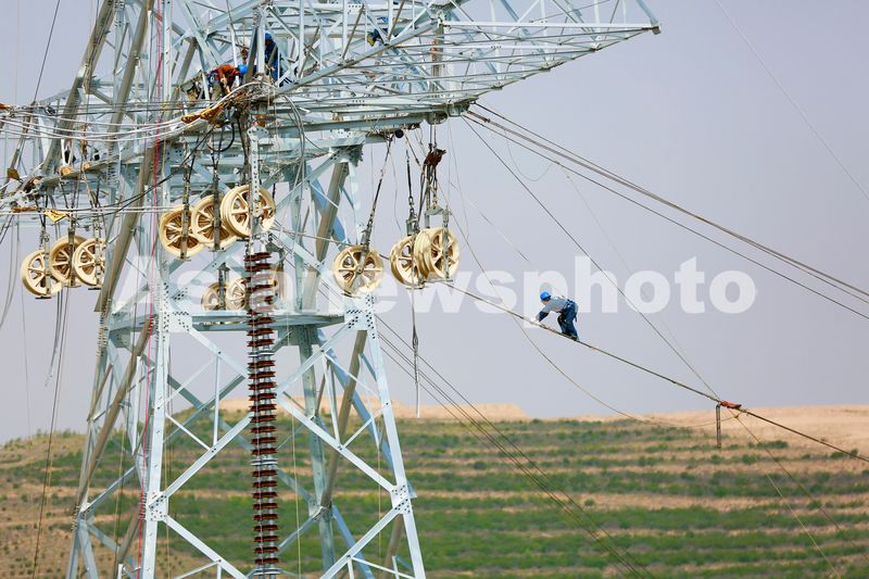 2024年5月16日,电力工人正在位于宁夏固原市隆德县境内的“宁电入湘”工程宁2标段进行导线展放作业。当日,随着电力工人将最后一根导线展放完成,标志着“宁电入湘”工程宁夏段#613-#619架线段最大难度线路跨越完成贯通。这也是近年来宁夏电网首次实施“4条交流线路+1条高速公路”同跨施工作业。