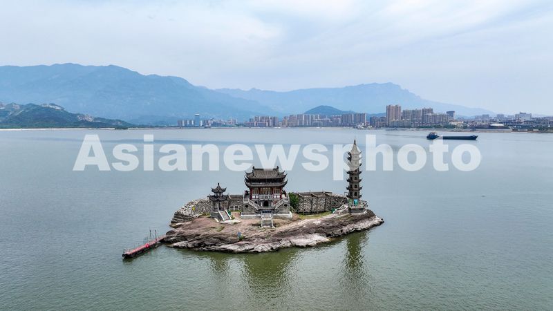 图片说明:2024年5月19日,俯瞰江西省庐山市鄱阳湖标志性景观落星墩,已隐入湖中成为“水中楼阁”。