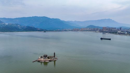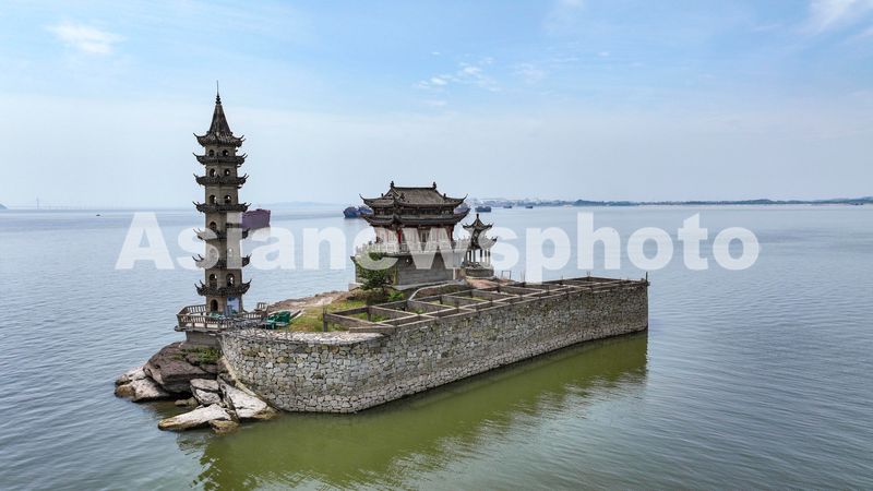 图片说明:2024年5月19日,俯瞰江西省庐山市鄱阳湖标志性景观落星墩,已隐入湖中成为“水中楼阁”。