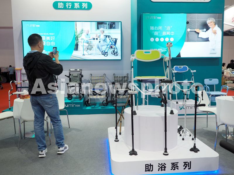 2024年5月21日,北京国家会议中心第十届中国国际养老服务业博览会,观众在参观“助行产品”。