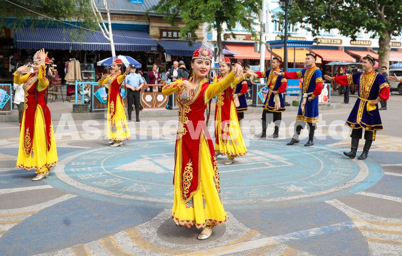 5月21日,在伊犁哈萨克自治州伊宁市喀赞其民俗旅游区,演员们在给游客表演节目。