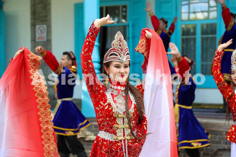 5月21日,在伊犁哈萨克自治州伊宁市喀赞其民俗旅游区,演员们在给游客表演节目。