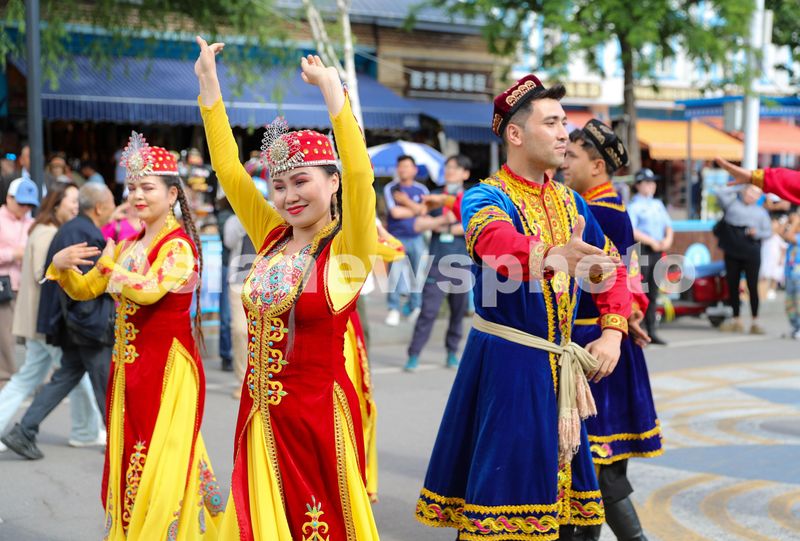 5月21日,在伊犁哈萨克自治州伊宁市喀赞其民俗旅游区,演员们在给游客表演节目。