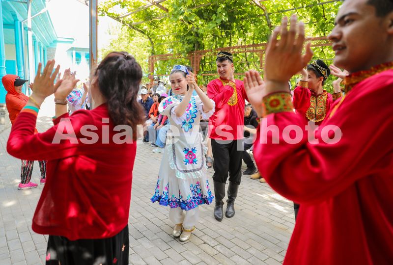 5月21日,在伊犁哈萨克自治州伊宁市喀赞其民俗旅游区,演员们和游客互动跳舞。