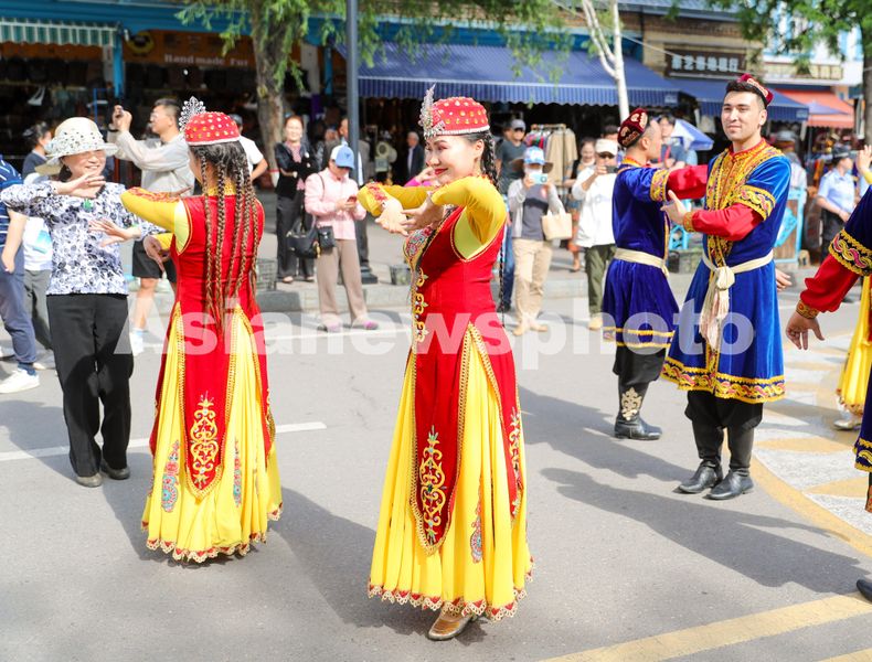 5月21日,在伊犁哈萨克自治州伊宁市喀赞其民俗旅游区,演员们在和游客互动。