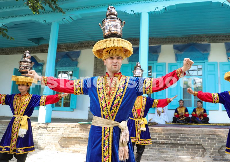 5月21日,在伊犁哈萨克自治州伊宁市喀赞其民俗旅游区,演员们在给游客表演节目。