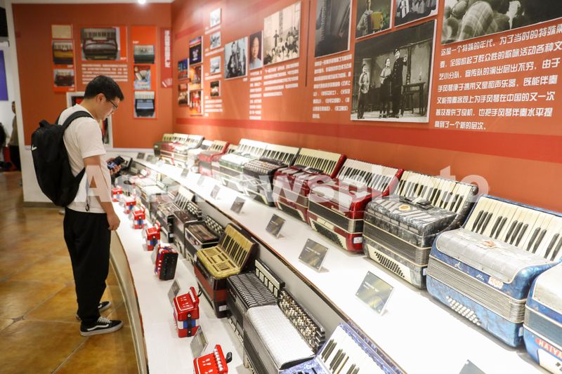 5月21日,在伊犁哈萨克自治州伊宁市六星街,游客在亚历山大手风琴珍藏馆参观。