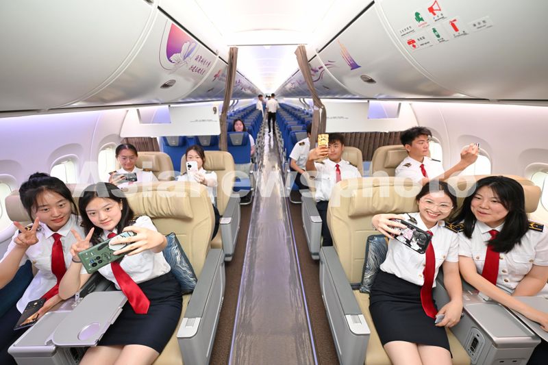 图片说明:民航大学的学生们在体验C919的头等舱
