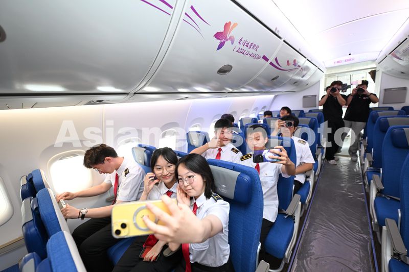 图片说明:民航大学的学生们登上C919大飞机参观体验