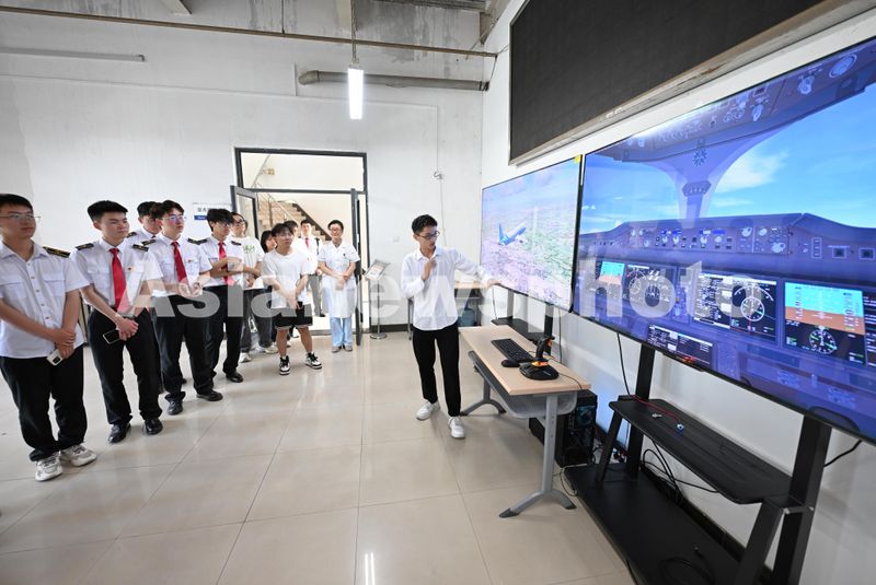 图片说明:工作人员在给学生们讲解C919的驾驶操作系统