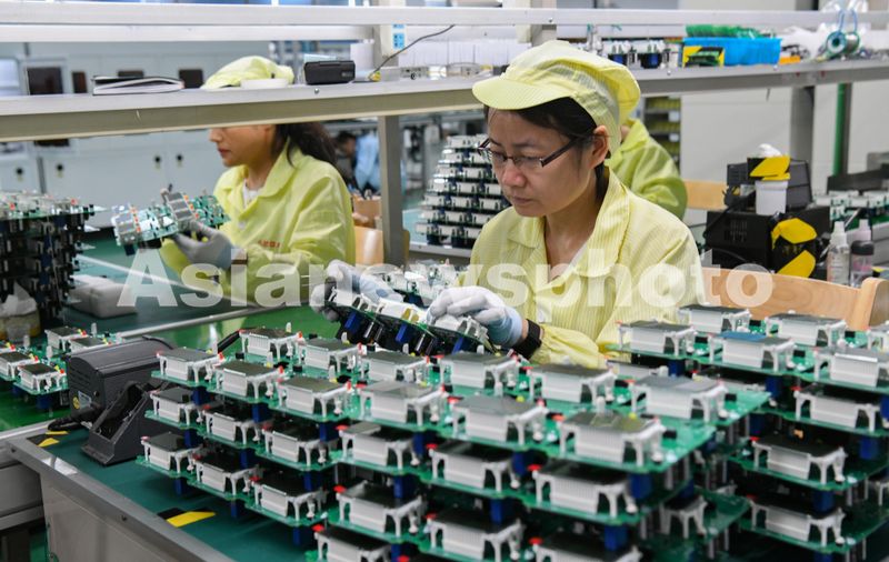 图片说明:2024年5月24日,浙江省金华市浙江八达电子仪表有限公司数字化车间生产线上,工人在赶制电能表订单。
