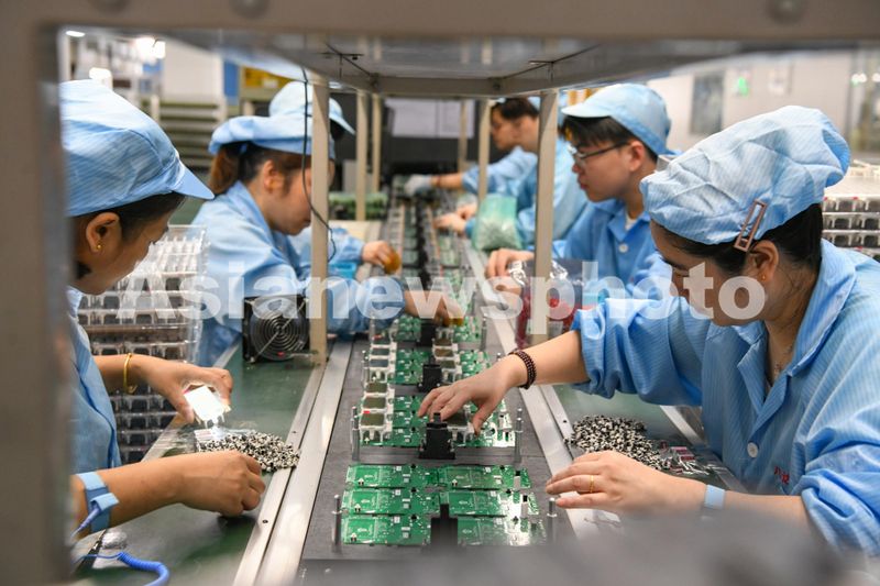 图片说明:2024年5月24日,浙江省金华市浙江八达电子仪表有限公司数字化车间生产线上,工人在赶制电能表订单。