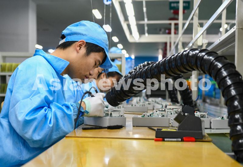 图片说明:2024年5月24日,浙江省金华市浙江八达电子仪表有限公司数字化车间生产线上,工人在赶制电能表订单。