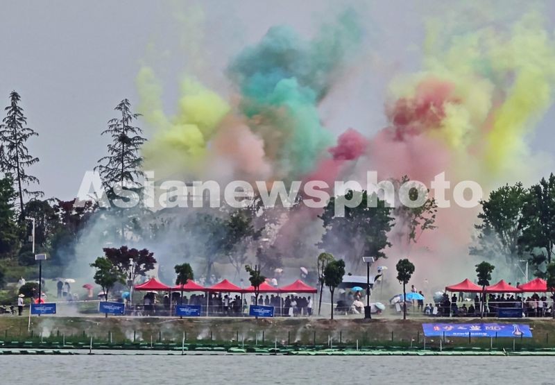 5月26日,2024年全国龙舟大联动活动暨湖北省龙舟公开赛(武汉·东西湖站)决赛,在武汉东西湖区杜公湖国家湿地公园举行。图为开幕式燃放绚丽多彩冷烟火。