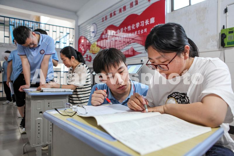 图片说明:5月27日晚上,在河南省焦作市博爱县第一中学,教师们“摆摊”,为学生答疑解惑。