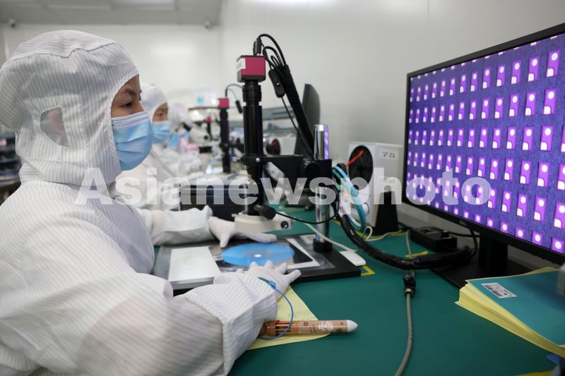 图片说明:2024年5月27日,位于福州高新区生物医药和机电产业园的福建兆元光电有限公司,工作人员在检测芯片产品。
