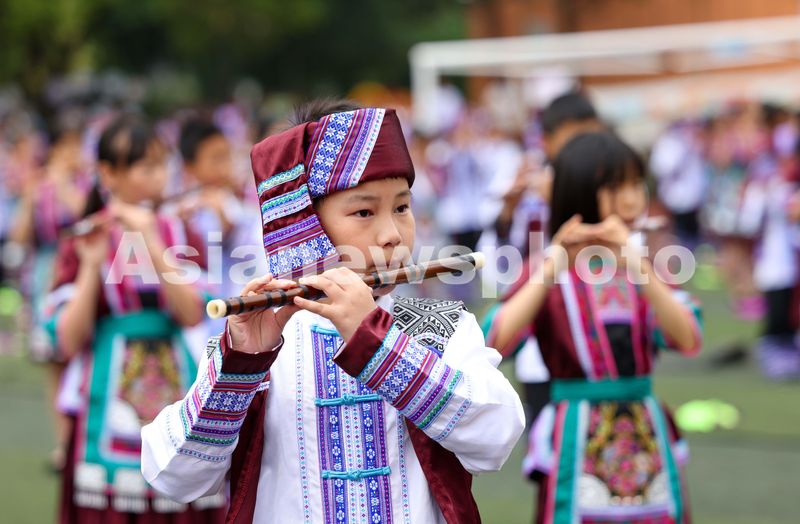 2024年5月29日,贵州省铜仁市玉屏侗族自治县印山民族小学的学生在吹奏非遗箫笛。