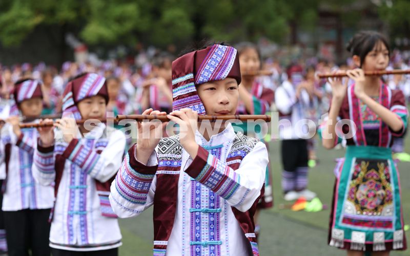 2024年5月29日,贵州省铜仁市玉屏侗族自治县印山民族小学的学生在吹奏非遗箫笛。