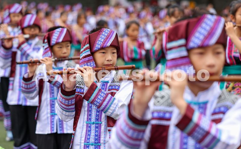 2024年5月29日,贵州省铜仁市玉屏侗族自治县印山民族小学的学生在吹奏非遗箫笛。