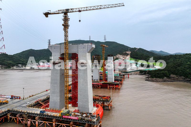2024年5月30日傍晚,站在浙江省舟山市定海区册子岛山头眺望,甬舟铁路西堠门公铁两用大桥墩身渐起、雏形初现、蔚为壮观。