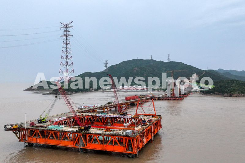 2024年5月30日傍晚,站在浙江省舟山市定海区册子岛山头眺望,甬舟铁路西堠门公铁两用大桥墩身渐起、雏形初现、蔚为壮观。