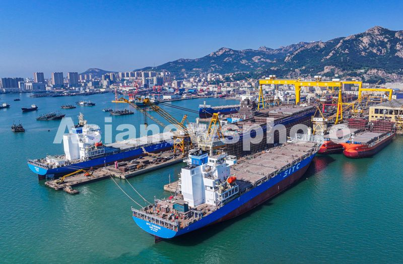 2024年6月3日,在山东省荣成市石岛管理区黄海造船有限公司船坞,工人抓紧建造各类大型船舶。