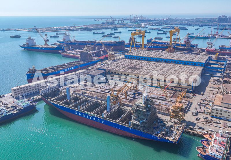 2024年6月3日,在山东省荣成市石岛管理区黄海造船有限公司船坞,工人抓紧建造各类大型船舶。