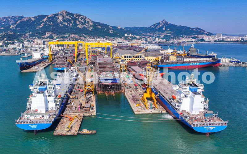2024年6月3日,在山东省荣成市石岛管理区黄海造船有限公司船坞,工人抓紧建造各类大型船舶。