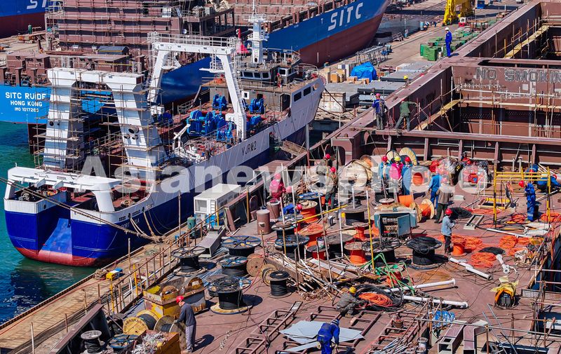 2024年6月3日,在山东省荣成市石岛管理区黄海造船有限公司船坞,工人抓紧建造各类大型船舶。