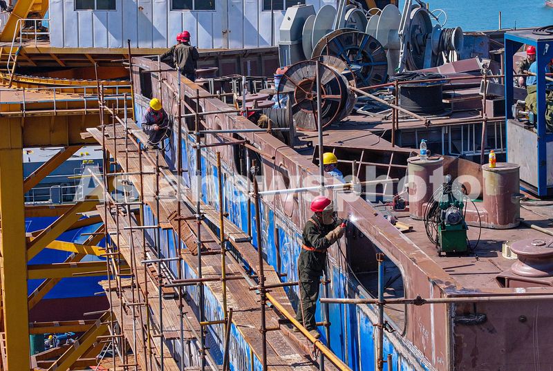 2024年6月3日,在山东省荣成市石岛管理区黄海造船有限公司船坞,工人抓紧建造各类大型船舶。