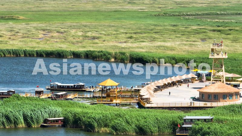 图片说明:6月3日,游客乘坐画舫船畅游博斯腾湖莲海世界景区。