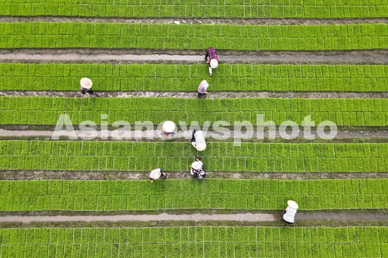 图片说明:2024年6月3日,在江苏省扬州市宝应县夏集镇水稻育秧基地,农民在田间管护水稻秧苗。