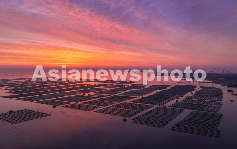 2024年6月5日,山东省荣成市石岛管理区桑沟湾海洋牧场出现绚丽朝霞,渔民驾驶渔船出海作业,与大海、日出、风力发电机交相辉映,构成一幅绚丽多姿的生态画卷。 荣成市桑沟湾位于北纬37°,水质优良,海产丰富,湾内现有我国北方最大规模的海上生态网箱养殖区,被评为国家级休闲渔业示范基地。近年来,荣成市在发展海洋经济的同时,积极探索碳汇产业,推广浅海多营养层级生态养殖新模式。