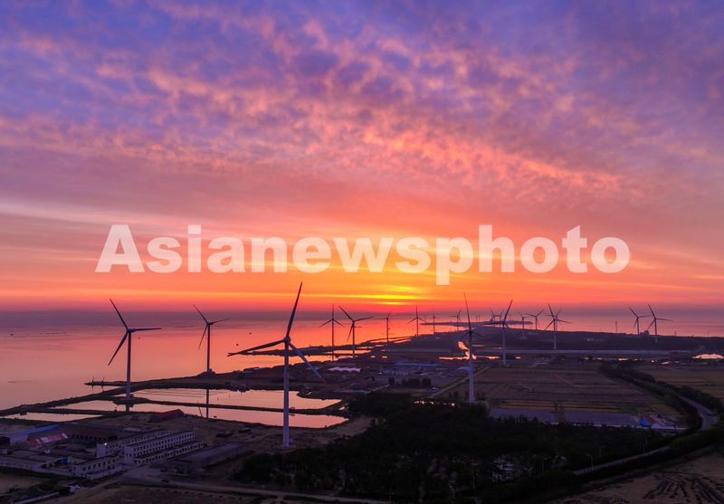 2024年6月5日,山东省荣成市石岛管理区桑沟湾海洋牧场出现绚丽朝霞,渔民驾驶渔船出海作业,与大海、日出、风力发电机交相辉映,构成一幅绚丽多姿的生态画卷。 荣成市桑沟湾位于北纬37°,水质优良,海产丰富,湾内现有我国北方最大规模的海上生态网箱养殖区,被评为国家级休闲渔业示范基地。近年来,荣成市在发展海洋经济的同时,积极探索碳汇产业,推广浅海多营养层级生态养殖新模式。