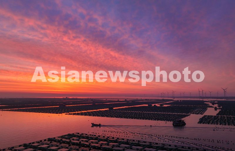 2024年6月5日,山东省荣成市石岛管理区桑沟湾海洋牧场出现绚丽朝霞,渔民驾驶渔船出海作业,与大海、日出、风力发电机交相辉映,构成一幅绚丽多姿的生态画卷。 荣成市桑沟湾位于北纬37°,水质优良,海产丰富,湾内现有我国北方最大规模的海上生态网箱养殖区,被评为国家级休闲渔业示范基地。近年来,荣成市在发展海洋经济的同时,积极探索碳汇产业,推广浅海多营养层级生态养殖新模式。