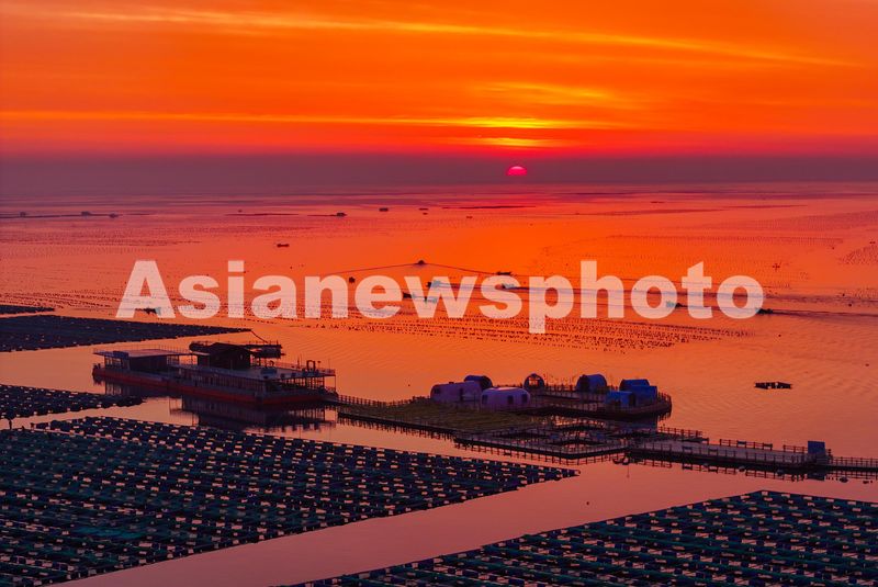 2024年6月5日,俯瞰朝霞满天的山东省荣成市石岛管理区桑沟湾海洋牧场。