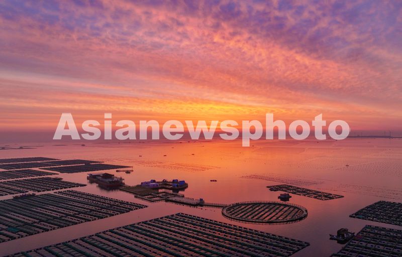 2024年6月5日,俯瞰朝霞满天的山东省荣成市石岛管理区桑沟湾海洋牧场。