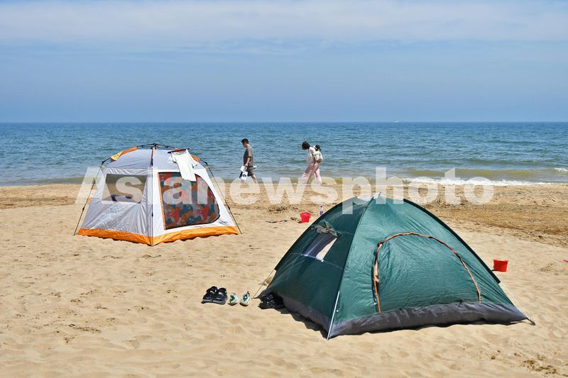 2024年6月10日,市民在山东烟台黄渤海新区金沙滩海水浴场露营纳凉。