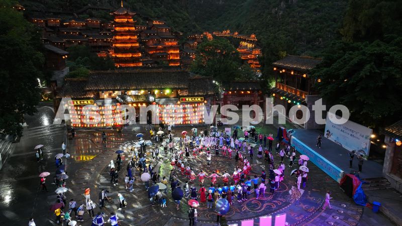 图片说明:6月9日,游客在贵州省黔西南布依族苗族自治州兴义市峰林布依景区观看表演。