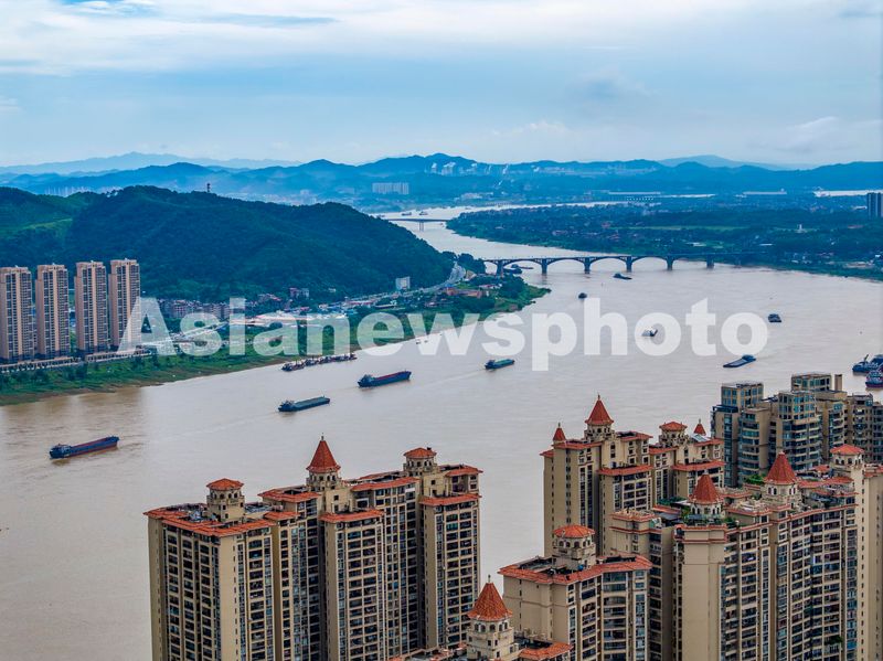 图片说明:2024年6月10日,装运生产和生活物资的货运船舶在西江广西梧州市区河段江面上往返穿梭(无人机照片)。