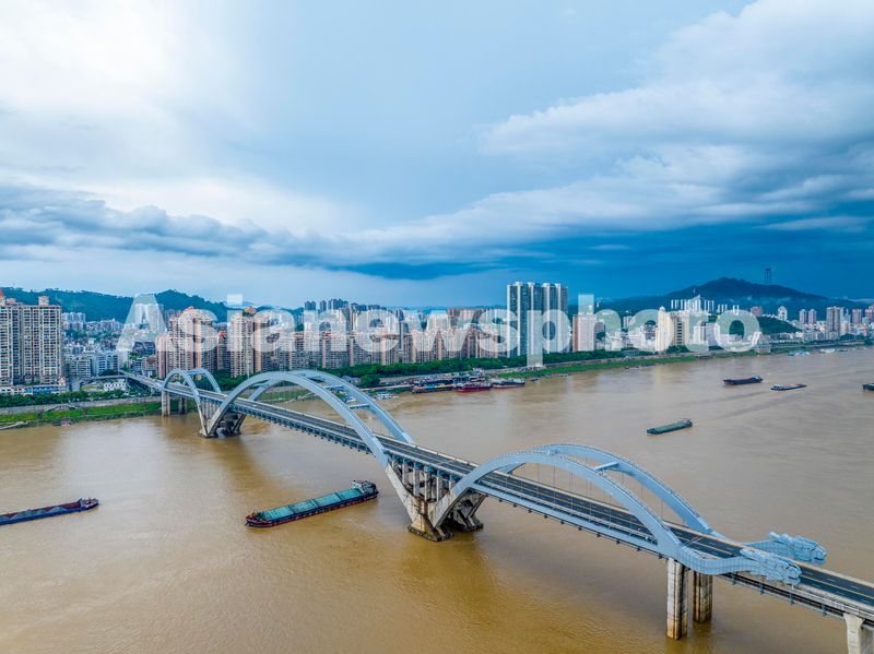 图片说明:2024年6月10日,装运生产和生活物资的货运船舶在西江广西梧州市区河段江面上往返穿梭(无人机照片)。