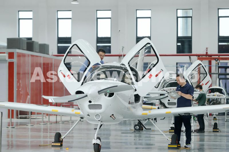 图片说明:2024年6月11日,在浙江省湖州市德清县通航智造小镇中航通飞车间,工作人员对领雁AG100飞机进行调试。