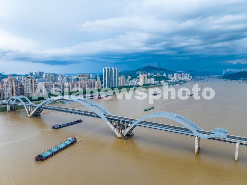 图片说明:2024年6月10日,装运生产和生活物资的货运船舶在西江广西梧州市区河段江面上往返穿梭(无人机照片)。