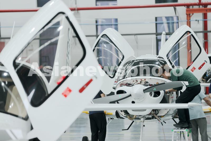 图片说明:2024年6月11日,在浙江省湖州市德清县通航智造小镇中航通飞车间,工作人员在组装生产领雁AG100飞机。