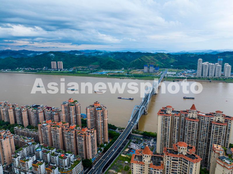 图片说明:2024年6月10日,装运生产和生活物资的货运船舶在西江广西梧州市区河段江面上往返穿梭(无人机照片)。