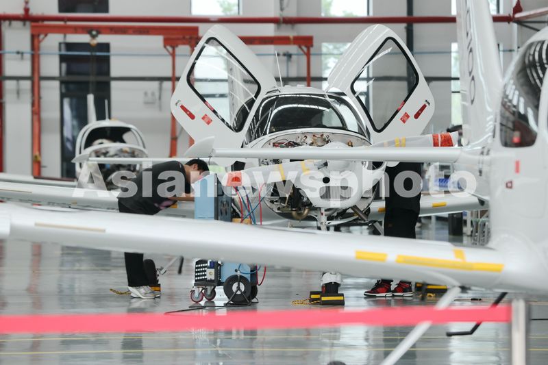 图片说明:2024年6月11日,在浙江省湖州市德清县通航智造小镇中航通飞车间,工作人员在组装生产领雁AG100飞机。