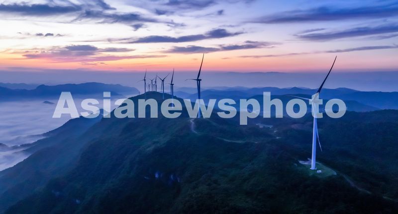 图片说明:2024年6月13日,江西省瑞昌市洪下乡蜈蚣山风电场,一台台发电机矗立在群山、云海之中,勾勒出一幅仙境般的美丽画卷。