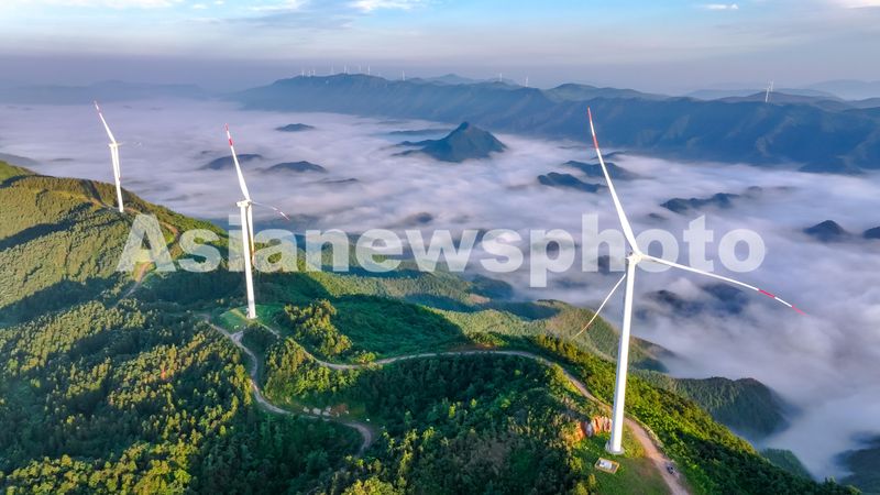 图片说明:2024年6月13日,江西省瑞昌市洪下乡蜈蚣山风电场,一台台发电机矗立在群山、云海之中,勾勒出一幅仙境般的美丽画卷。